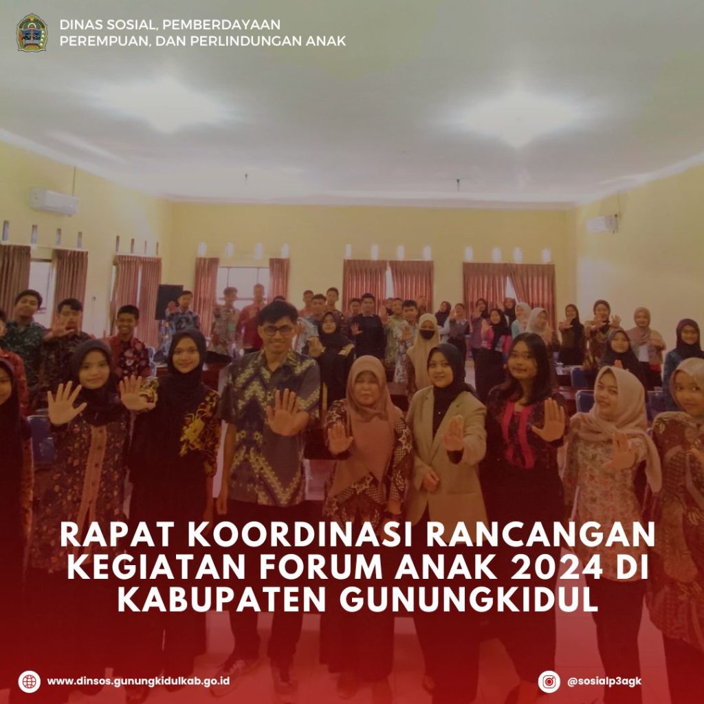 Pada Sabtu, 6 Juli 2024, Dinas Sosial Pemberdayaan Perempuan dan Perlindungan Anak Kabupaten Gunungkidul mengadakan rapat koordinasi untuk membahas rancangan kegiatan Forum Anak 2024. Rapat ini berlangsung di Ruang Rapat Welas Asih dan dihadiri oleh berbagai pihak yang terlibat dalam perencanaan kegiatan.