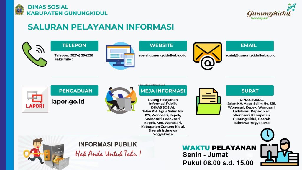 Semua pelayanan yang ada pada Dinas Sosial, Pemberdayaan Perempuan, dan Perlindungan Anak Kabupaten Gunungkidul tidak dipungut biaya/GRATIS.